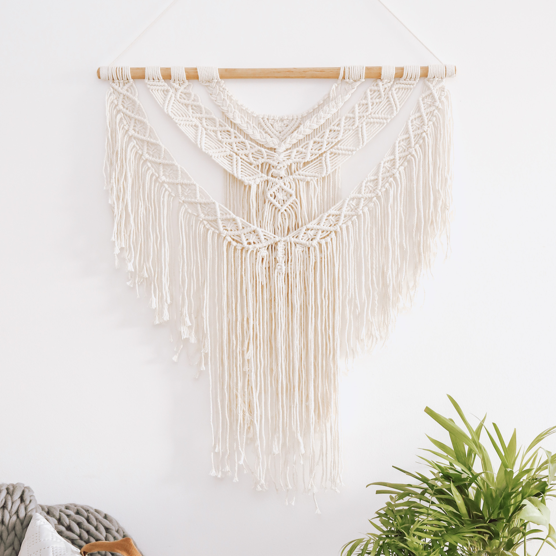 ručně vyrobené macramé z Bali. Dekorační prvek na zeď, drhaný v rámci malé lokální komunity za podmínek fair trade.