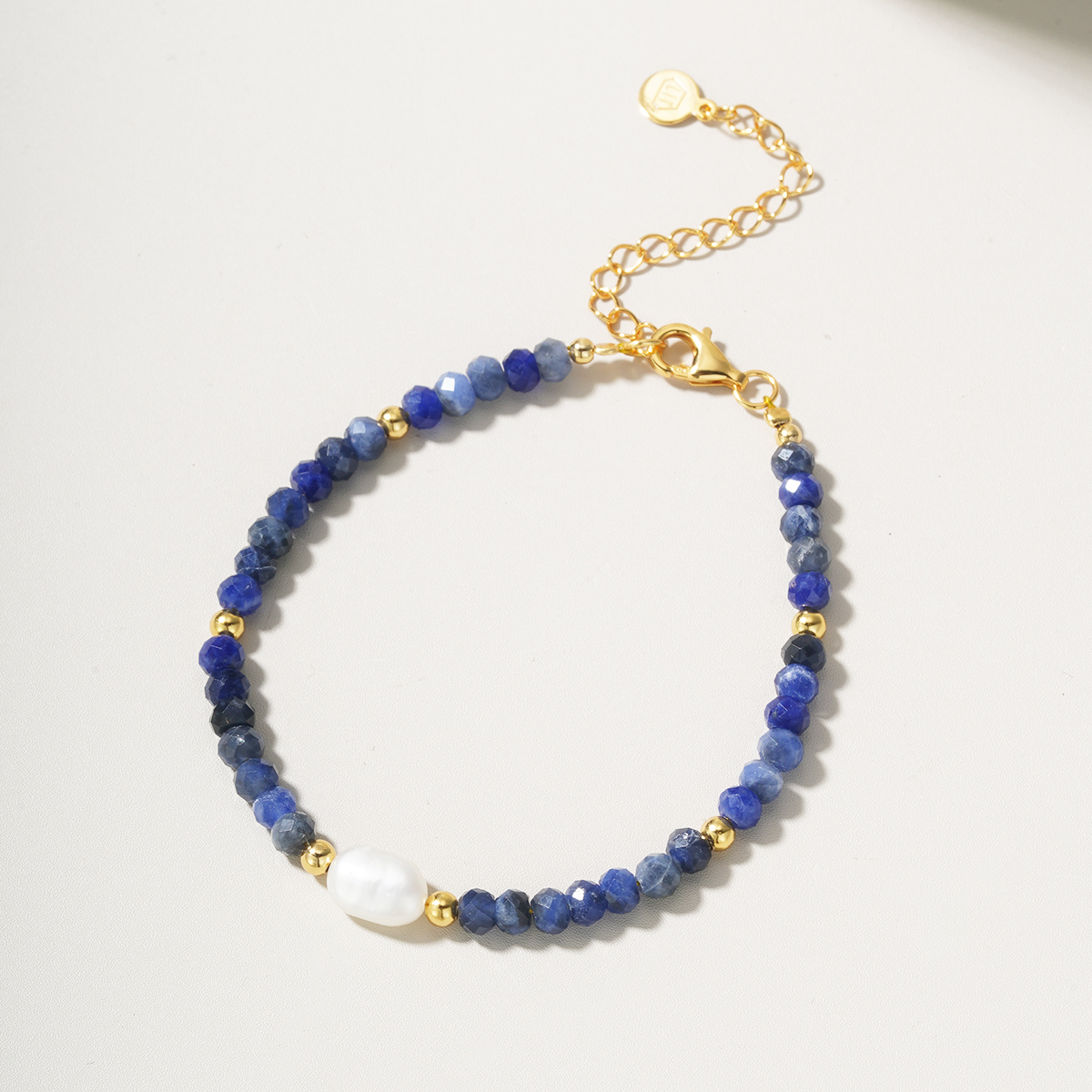 Náramek Sodalit s perlou – harmonie klidu a nadčasové elegance. Díky elegantnímu a přitom přirozenému designu se náramek hodí ke každodennímu nošení i ke slavnostnějším příležitostem. Snadno se kombinuje s dalšími šperky a stane se oblíbeným doplňkem pro ženy, které milují šperky s významem a jemnou energií přírodních kamenů.