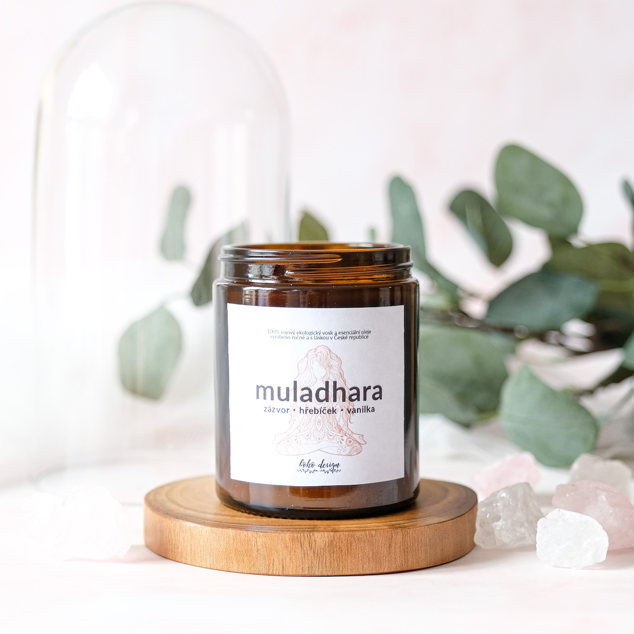 Sójová svíčka 1. čakra “MULADHARA” s vůní esenciálních olejů, nabitá pozitivní energií křišťálu a ozdobená sušenými květy jasmínu a růže pro ještě krásnější boho život. Rozmazlete své smysly omamnou vůní vanilky, hřebíčku a zázvoru.