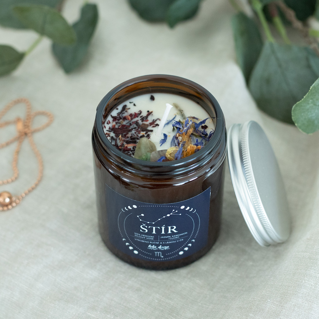 Sójová svíčka ve znamení Štíra s vůní esenciálních olejů, nabitá pozitivní energií fluoritu a ozdobená sušenými květy chrpy a ibišku pro ještě krásnější boho život. Rozmazlete své smysly krásnou vůní jasmínu a kardamonu.